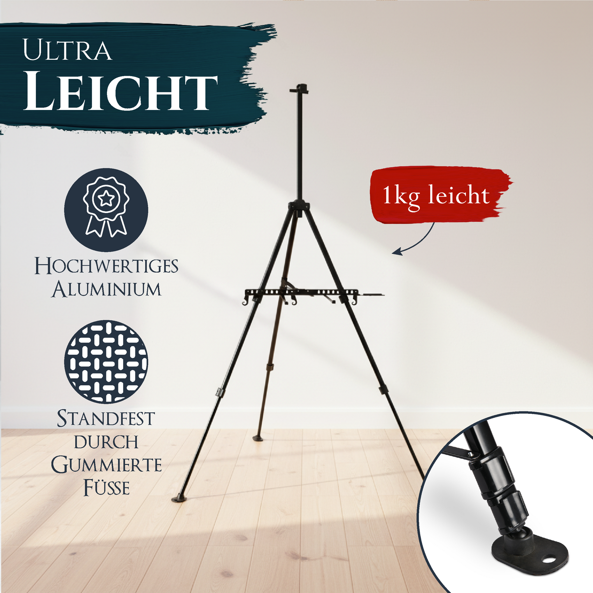 Bei einem Gewicht von nur 1 kg lässt sich diese standfeste und stabile Aluminiumstaffelei leicht transportieren und ist auch überall sehr schnell aufzubauen.