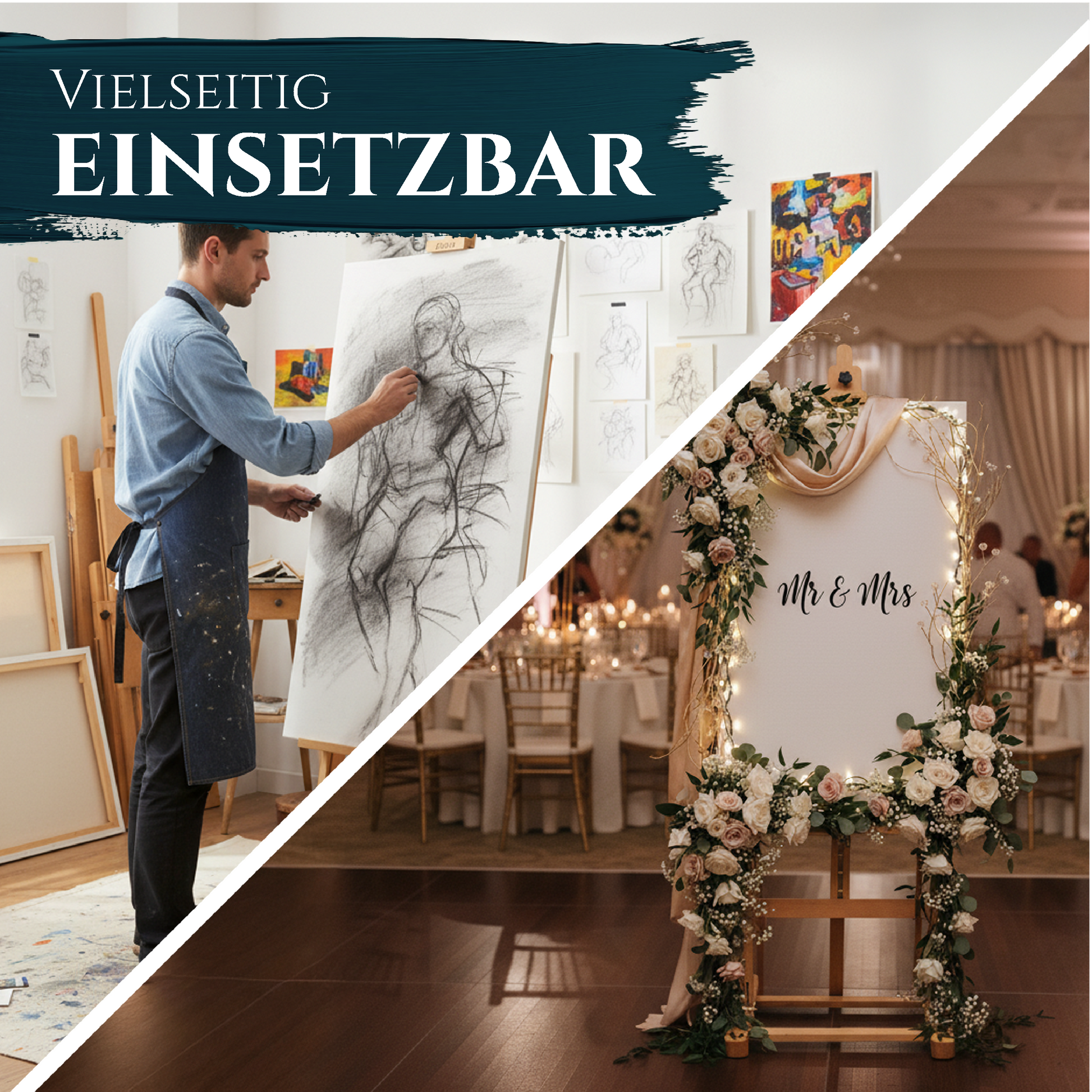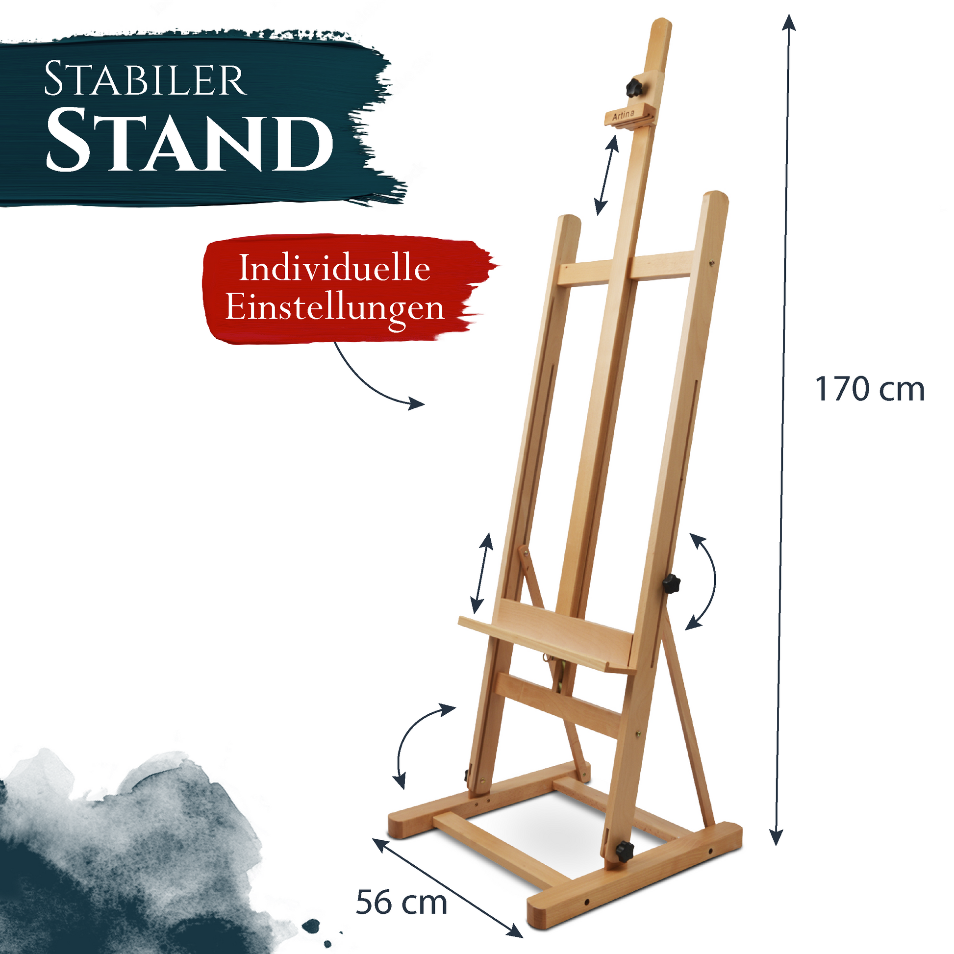 Die maximale Bildhöhe (Abstand Boden - Oberkante Leinwand) beträgt ca. 240 cm. Durch die massiven Standfüße (ca. 56 x 56 cm) steht diese Staffelei sehr stabil.