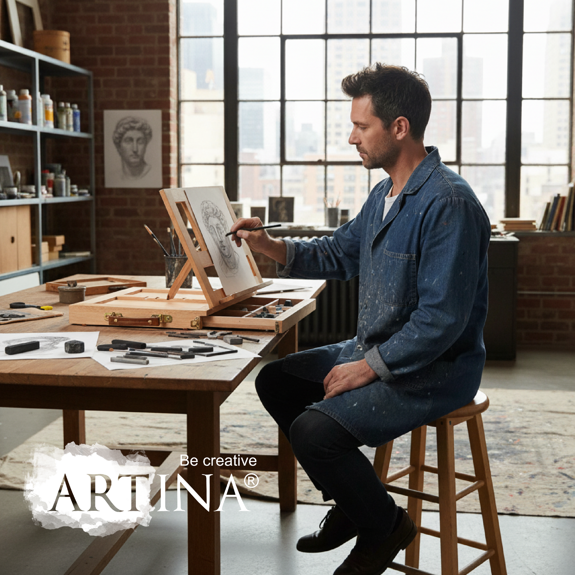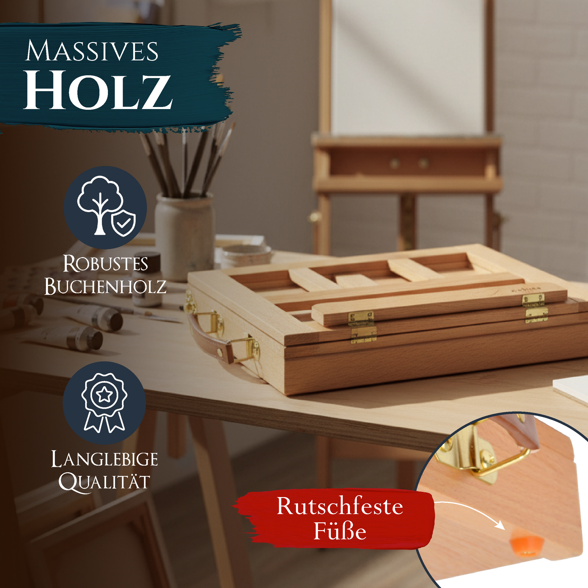 Die hochwertige Tischstaffelei Colmar von Artina mit Kofferfunktion hat eine Arbeitsfläche die in vier Stufen nach hinten um 90° geneigt werden kann. Die Staffelei kann für alle möglichen Maltechniken genutzt werden. Die 33,5 x 26 cm große Auflagefläche für den Keilrahmen und eine klappbare Malauflage in der Größe von 26,5 x 3,5 cm ermöglichen einen sicheren Halt der Leinwand. Die vier Gummifüße garantieren dabei einen sicheren und rutschfesten Stand der Staffelei. Eine Schublade mit 3 Fächern zur Aufbewahrung Ihrer Malutensilien komplettiert diese praktische Tischstaffelei.