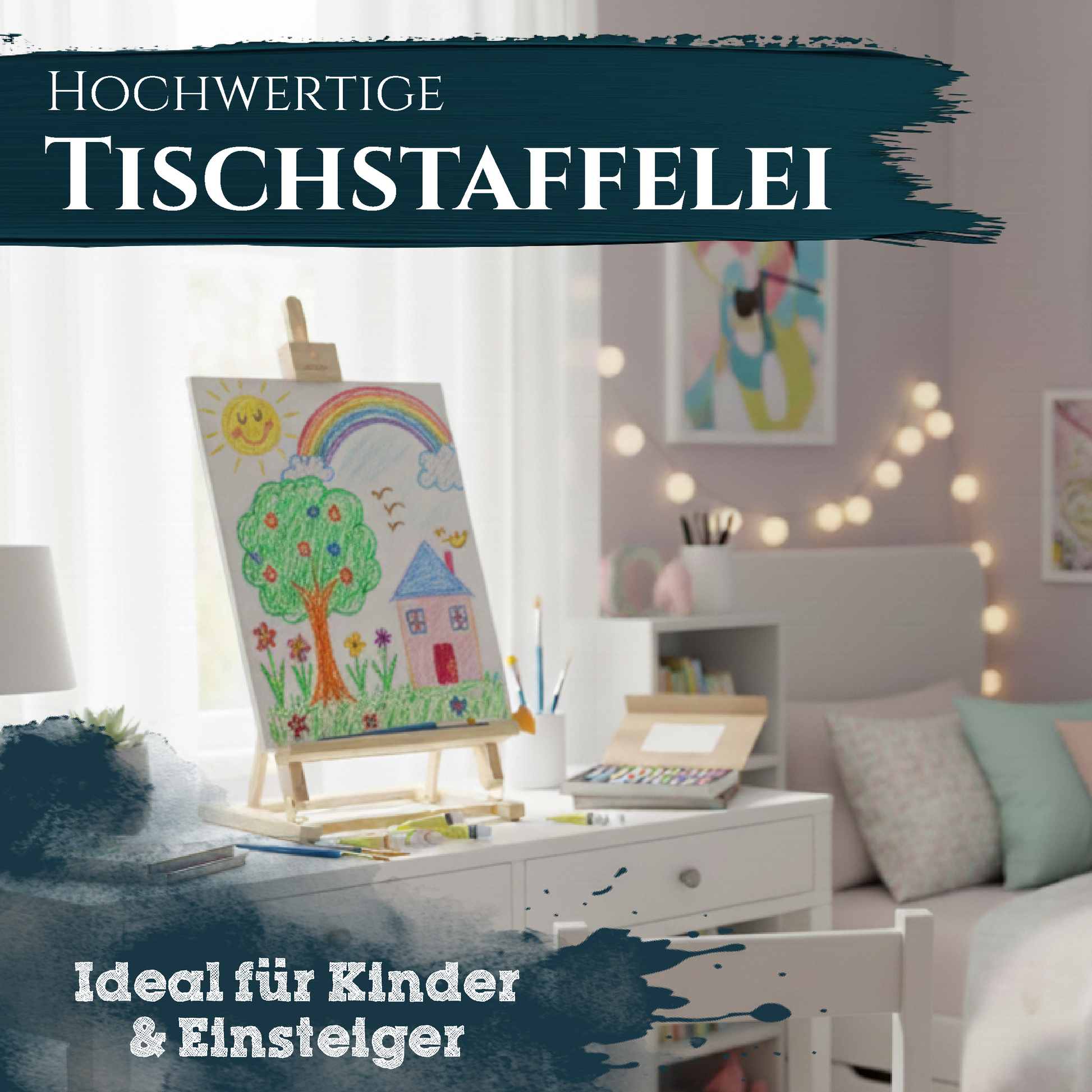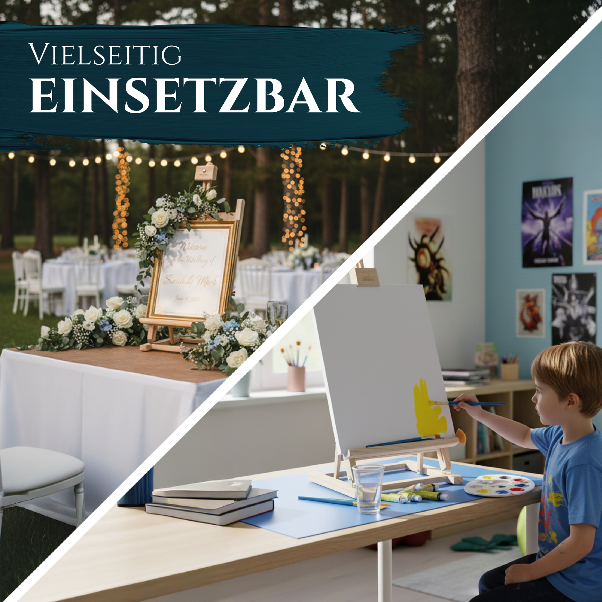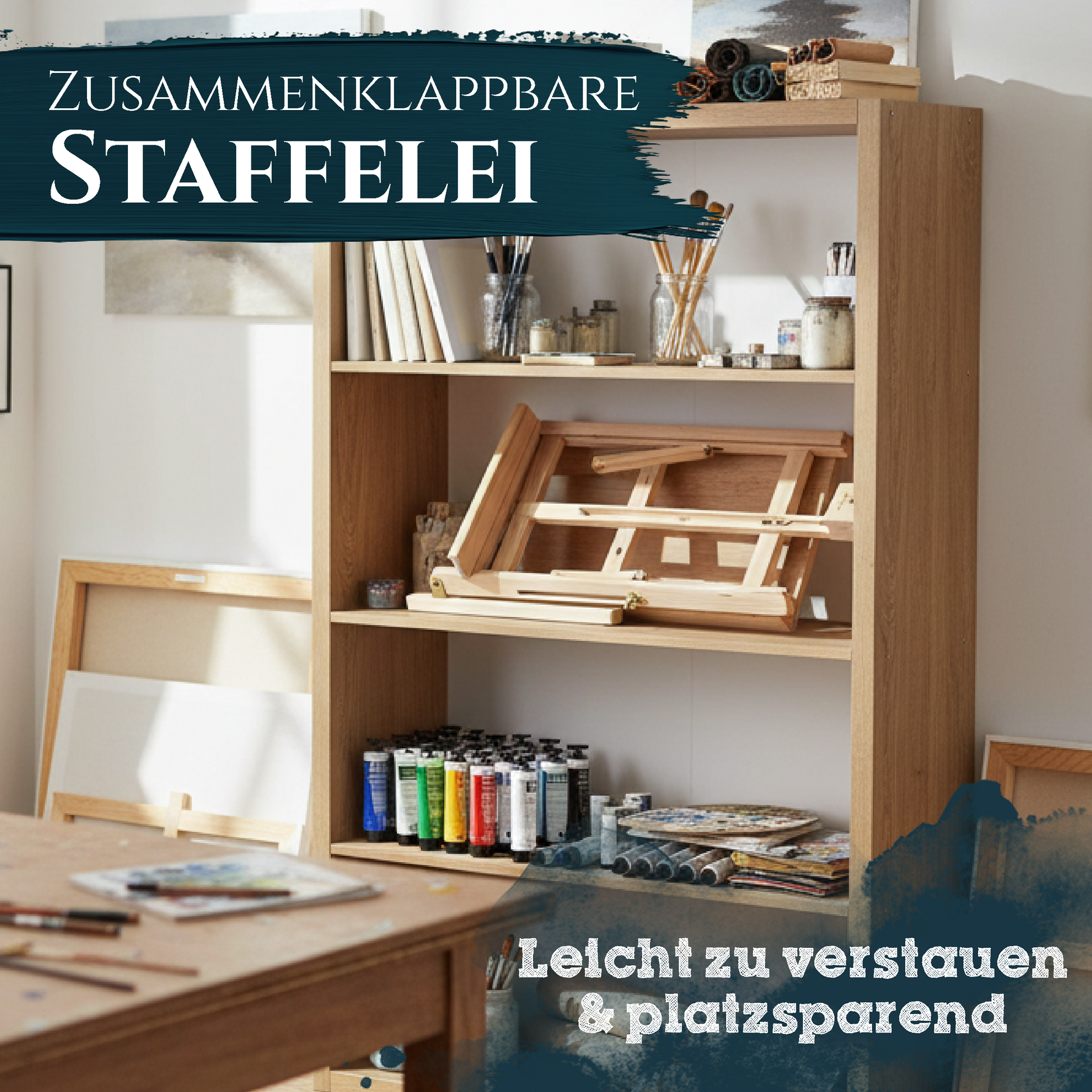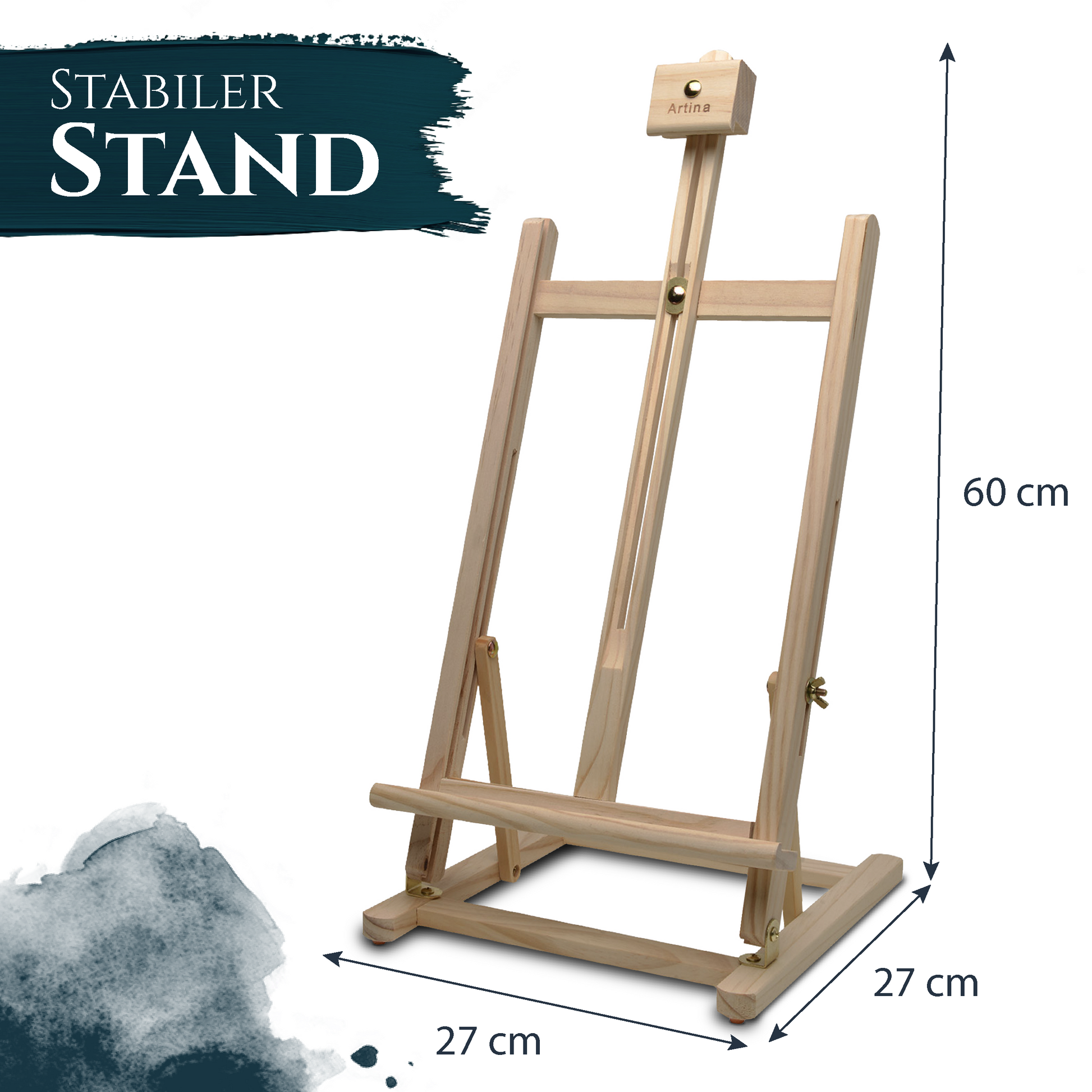 Diese Staffelei ist sowohl für Einsteiger wie auch für Hobbykünstler geeignet, die auf großen Leinwänden (bis 45 x 80 cm (H x B)) auf dem heimischen Tisch malen möchten. Ebenfalls hervorragend für Präsentationen beispielsweise in Schaufenstern geeignet.
